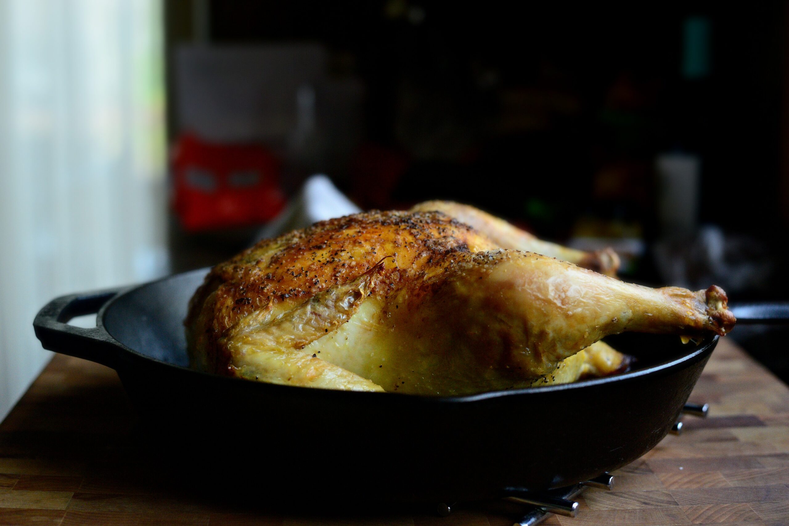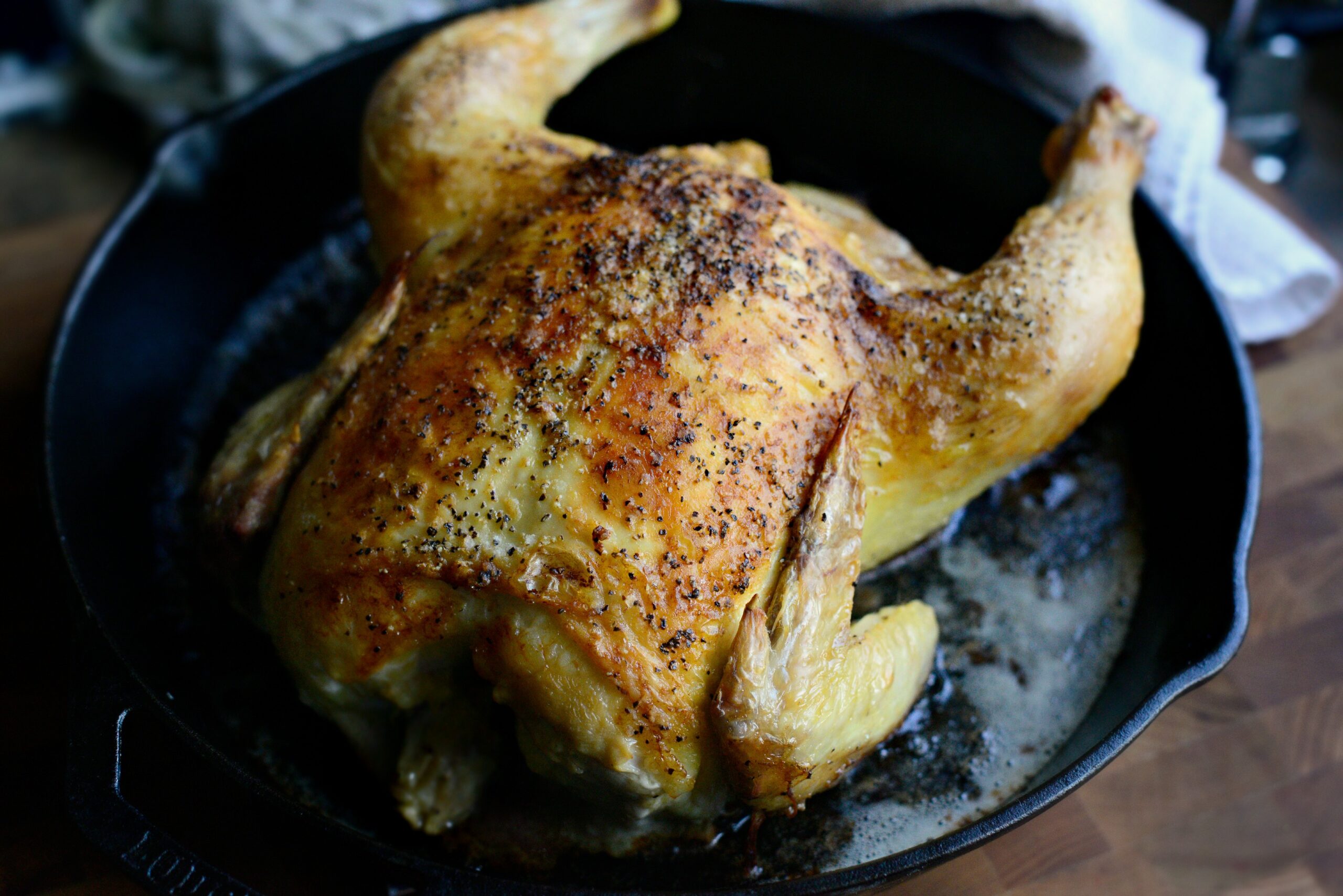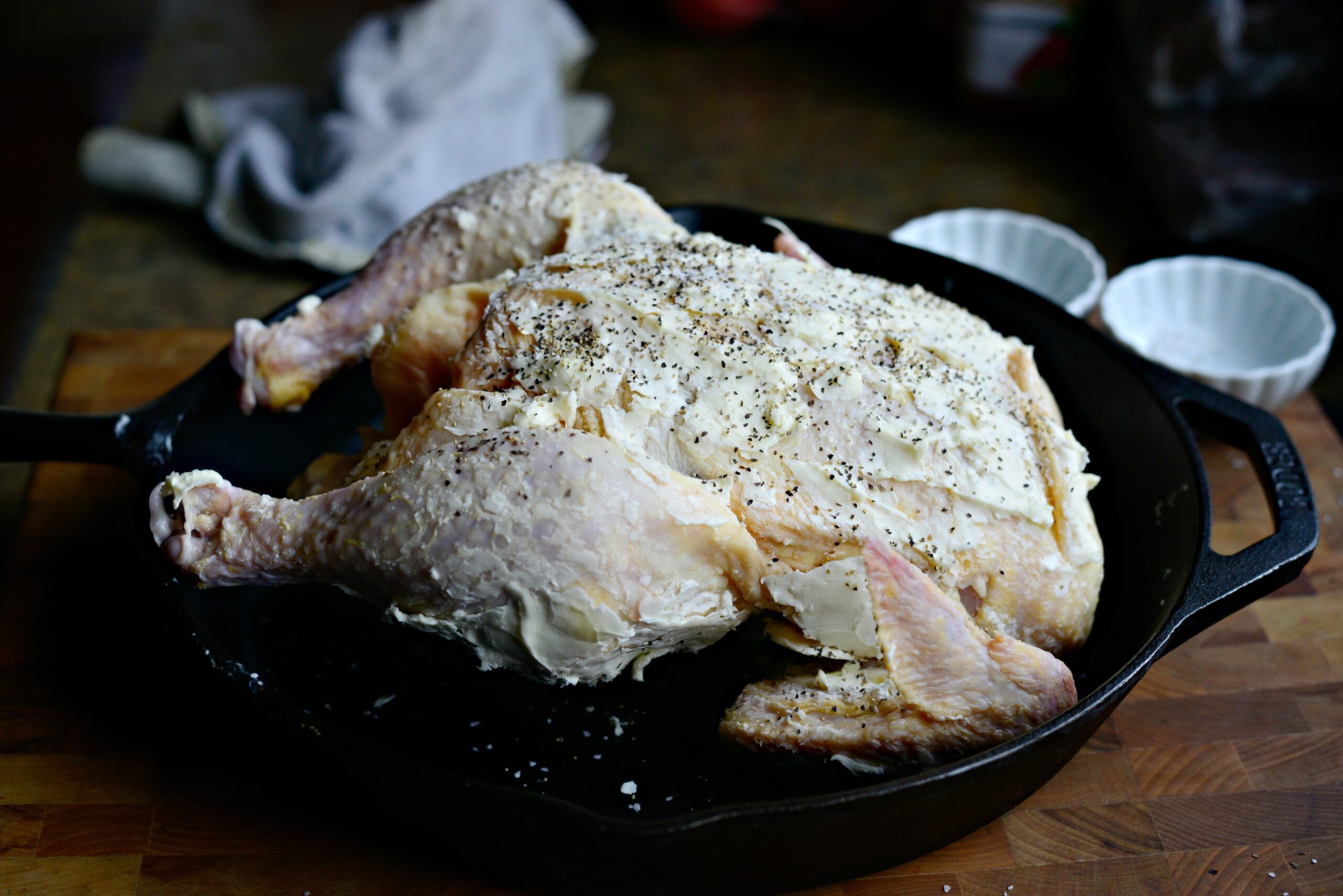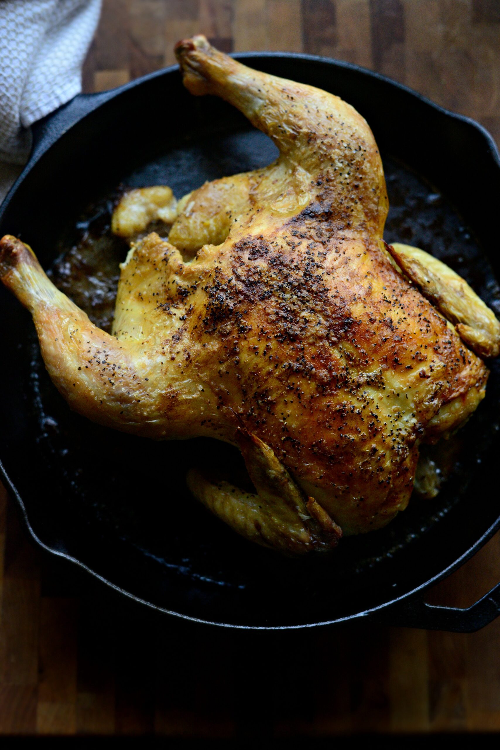 - Приправьте курицу внутри и снаружи большим количеством соли и черного перца. Я даже не измеряю. Просто солю и перчу. Затем поместите курицу грудкой вверх в чугунную сковороду, диаметром 28-30 см