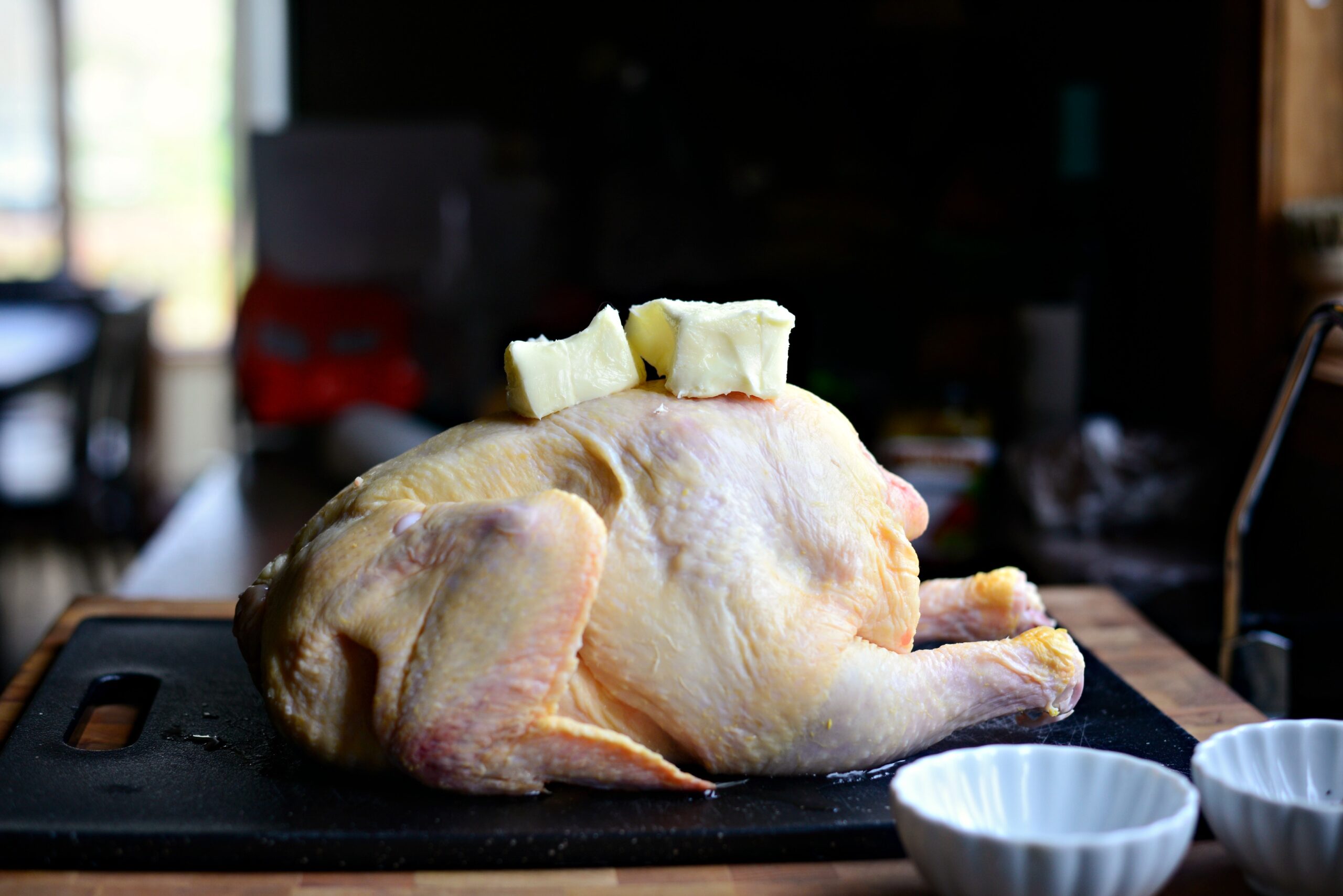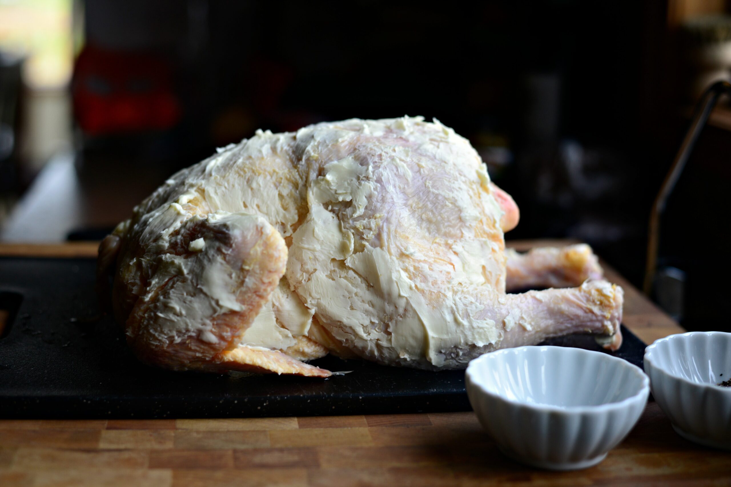 - Возьмите все сливочное масло и распределите его по всей тушке равномерно. Масло должно быть растаявшее! Использование сверхмягкого масла облегчает намазывание.