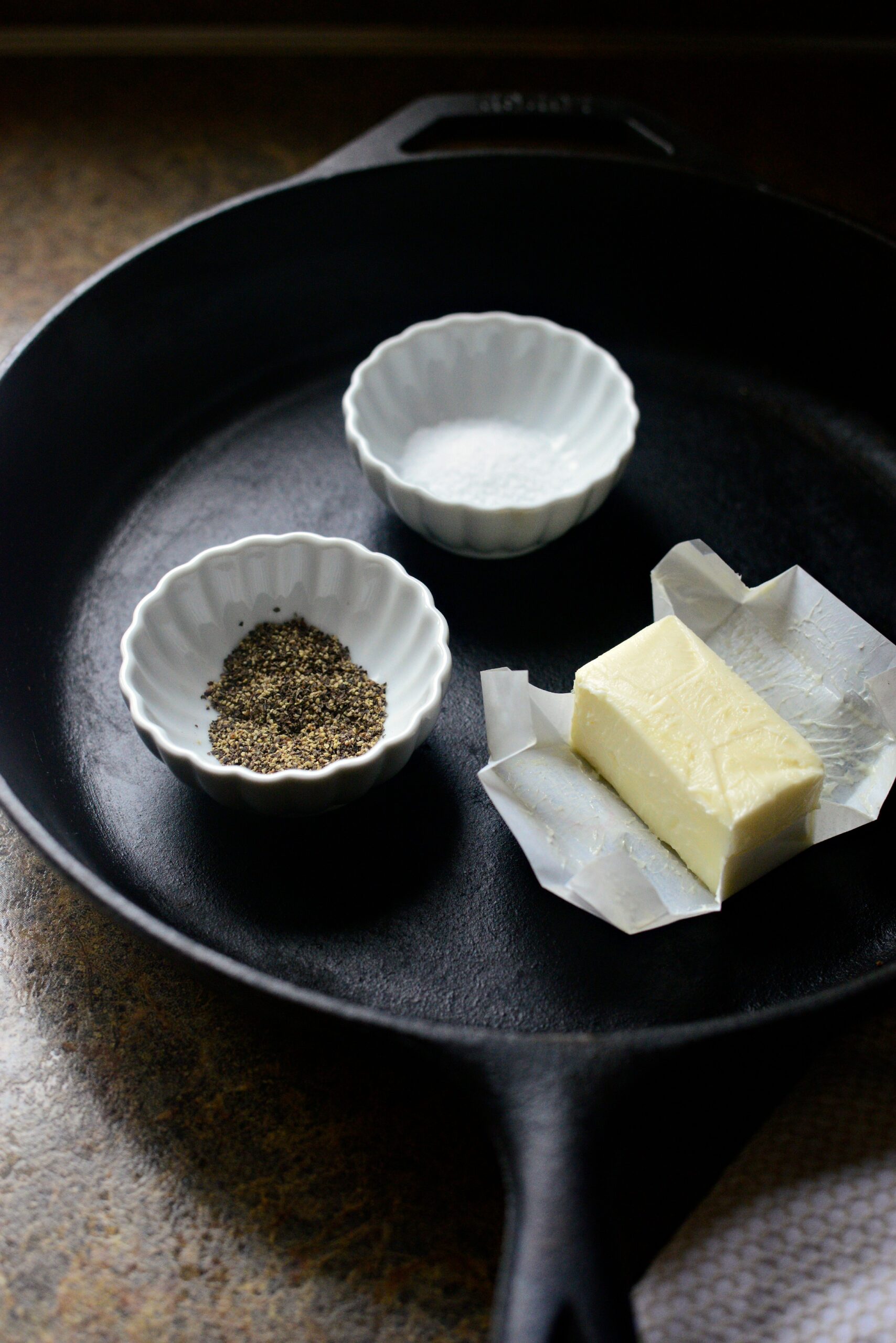 - Соль, черный перец (у меня средний помол), очень мягкое сливочное масло и чугунная сковорода.