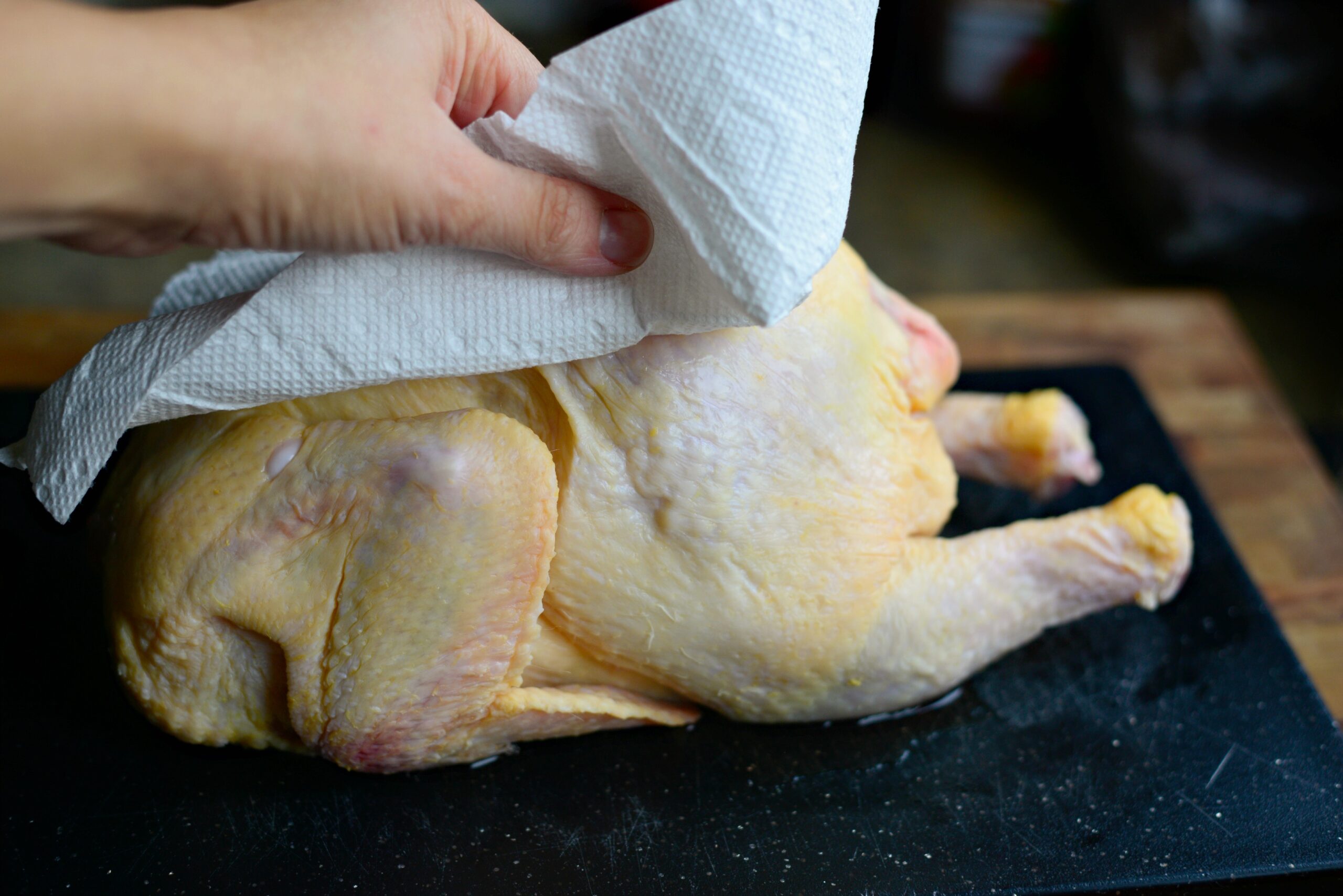 - Если курица НЕ потрашенная — уберите все лишнее внутри. Вы можете добавить их в соус или начинку, решать вам. Затем промокните все это насухо бумажным полотенцем.
