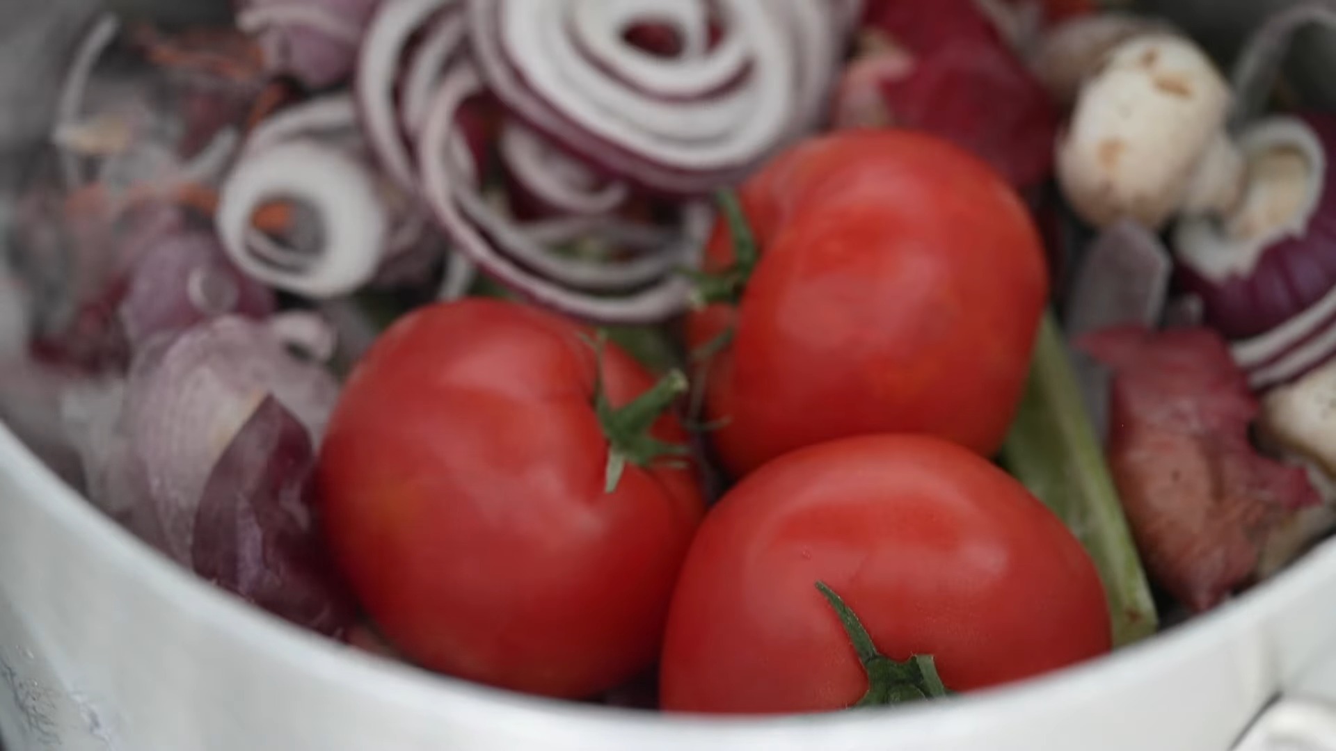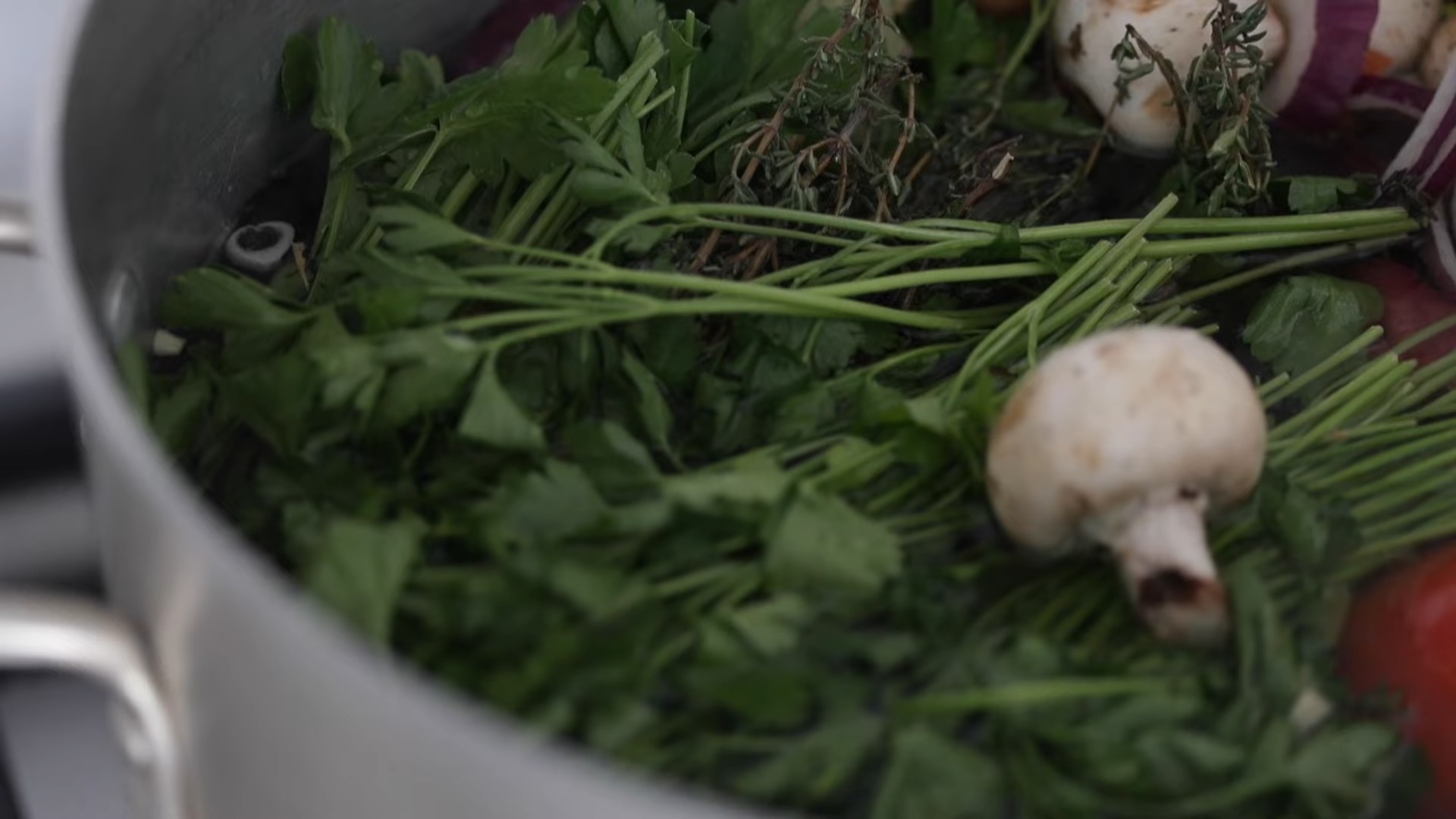- Затем добавьте все оставшиеся ингредиенты: грибы, петрушку, замороженные остатки овощей, помидоры, репчатый лук колечками