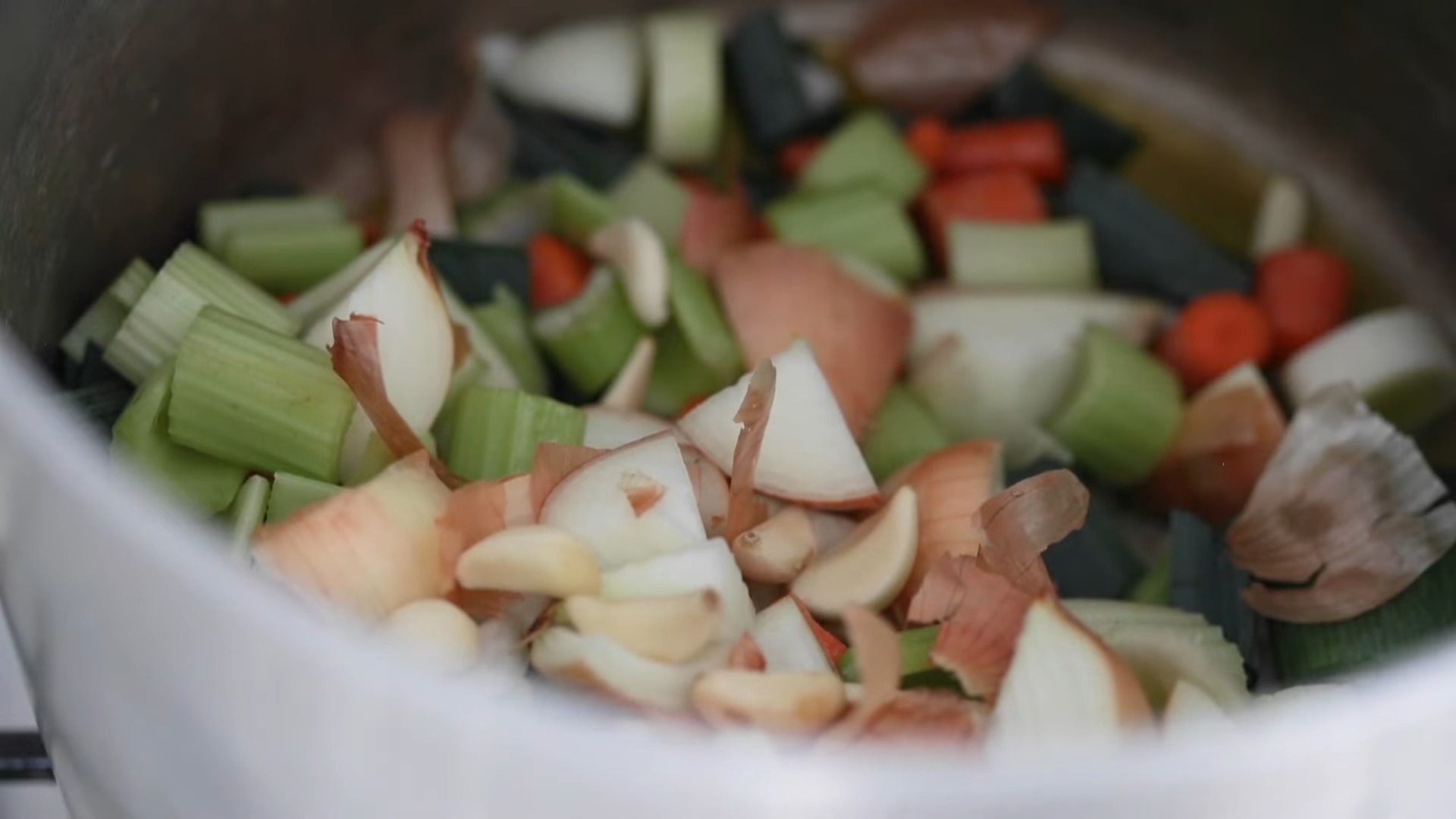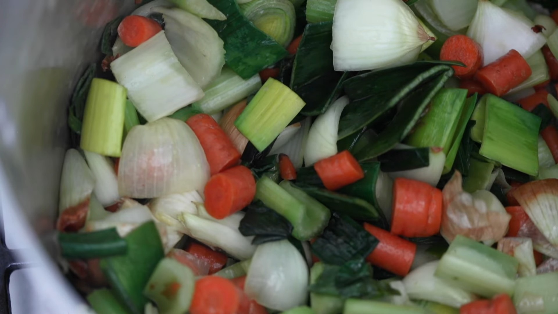 Возьмите очень большую кастрюлю (10-12 литров), разогрейте ее на медленном огне и добавьте оливковое масло и слегка обжарьте лук, сельдерей, морковь, лук-порей и зубчики чеснока в течение 15-20 минут. Не зажаривать.