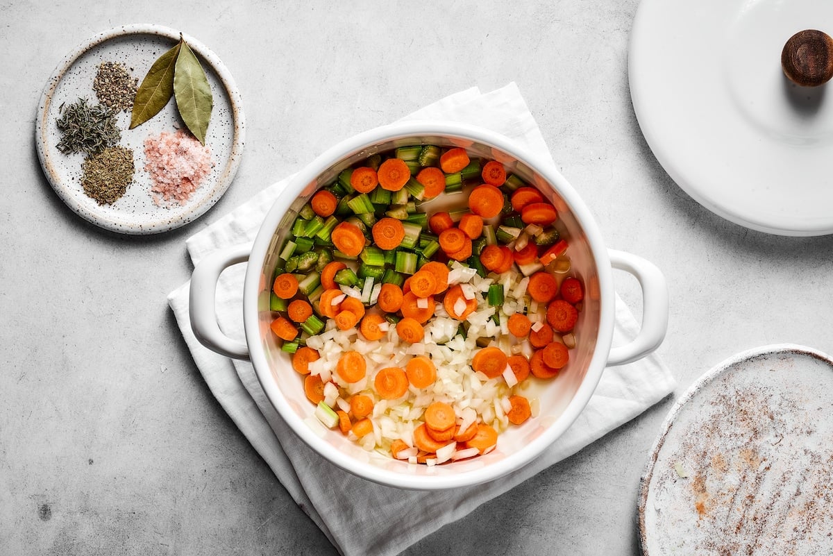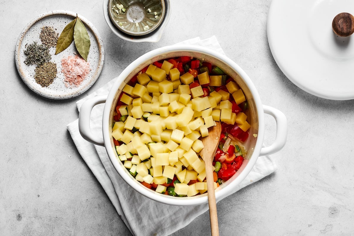 Добавьте нарезанный лук, морковь и сельдерей в большую кастрюлю и тушите до мягкости. затем добавьте чеснок, красный перец, цуккини и картофель и готовьте еще пару минут.